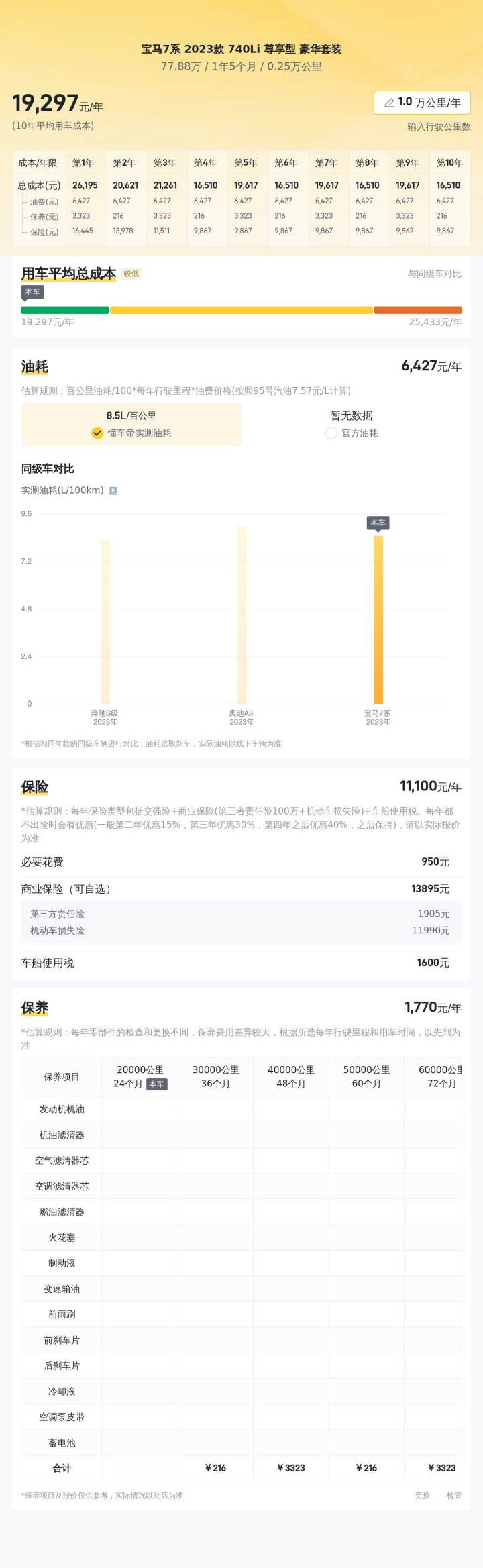 根据懂车帝平台数据显示,同款二手宝马7系 2023款 740Li 尊享型 豪华套装的10年平均用车成本约为21,185元/年,而本车的10年平均用车成本约为21,073元/年,相差不大,基本一致。