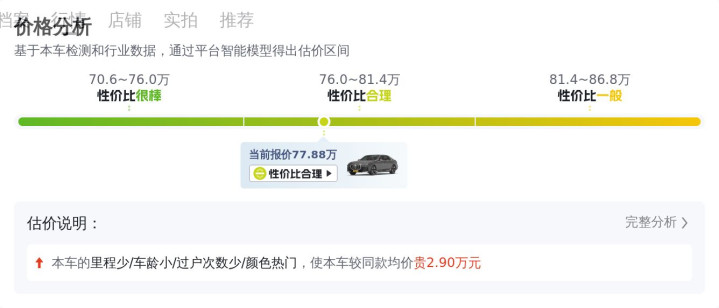 二手车不同于新车,在价格制定时会考虑车辆的里程、车龄、过户次数、颜色等多个因素。具体到这款车,影响价格的主要因素有:里程,少于均值0.5万公里,加价5100元;车龄,少于均值0.2年,加价7300元;过户次数,少于均值0.7次,加价7000元;颜色,黑色,加价9611元。这些因素的优劣,都会直接影响这款车的最终售价。